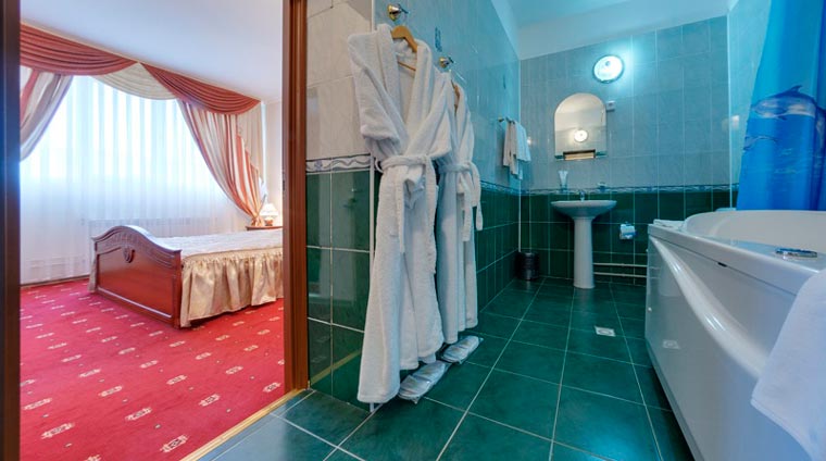 Гостиная оборудована диваном, журнальным столиком, телевизором и рабочей зоной. Спальня с двуспальной кроватью и вторым телевизором. Просторная ванная комната с джакузи — для истинного расслабления после лечебных процедур.